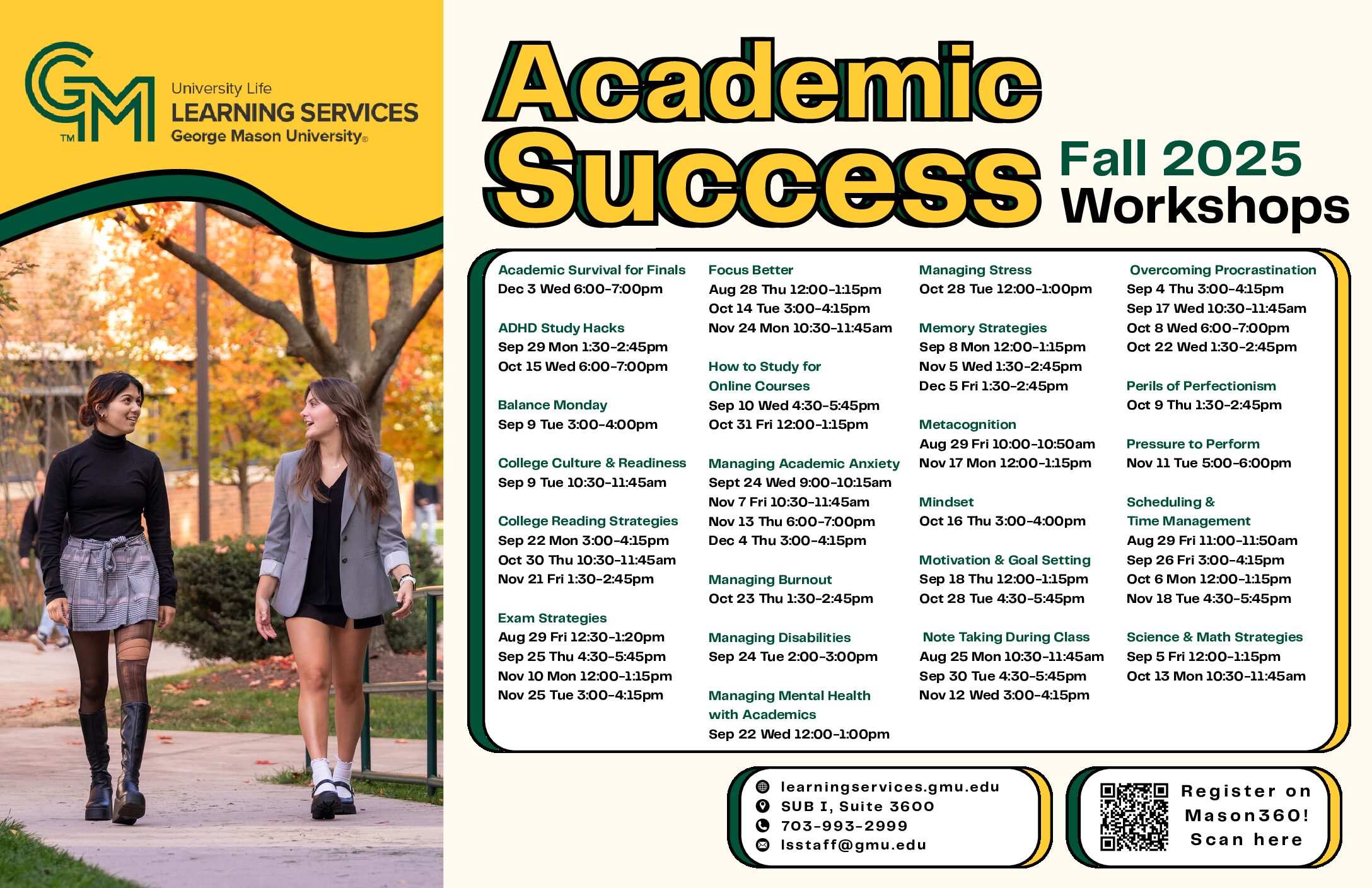 For a variety of reasons, including accessibility, Learning Services hosts our Academic Success Workshops primarily virtually. You can register for an upcoming Academic Success Workshop on Mason360 to receive the meeting link via your Mason email.